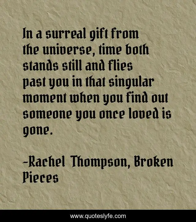 This page presents the quote "In a surreal gift from the universe, time both stands still and flies past you in that singular moment when you find out someone you once loved is gone.". Author of this quote is Rachel Thompson, Broken Pieces. This quote is about death, love, affection, feelings,.