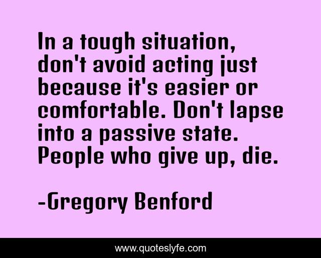 This page presents the quote "In a tough situation, don't avoid acting just because it's easier or comfortable. Don't lapse into a passive state. People who give up, die.". Author of this quote is Gregory Benford. .