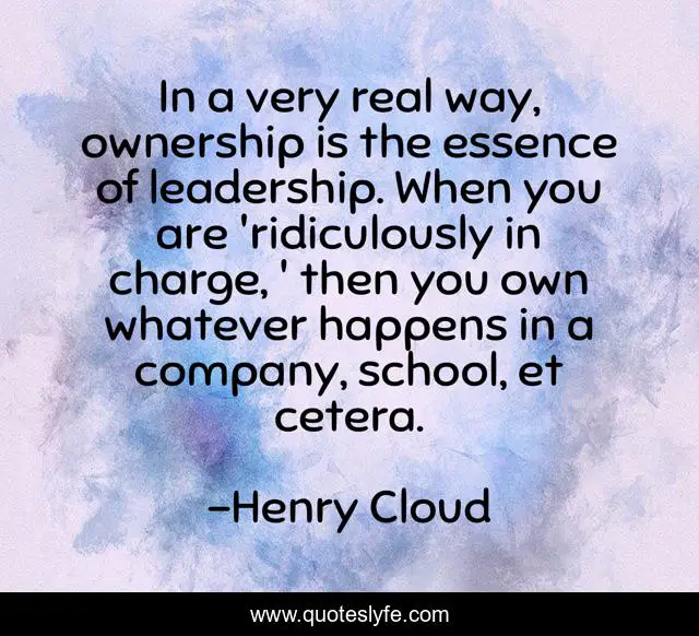 This page presents the quote "In a very real way, ownership is the essence of leadership. When you are 'ridiculously in charge, ' then you own whatever happens in a company, school, et cetera.". Author of this quote is Henry Cloud. This quote is about school, company,.