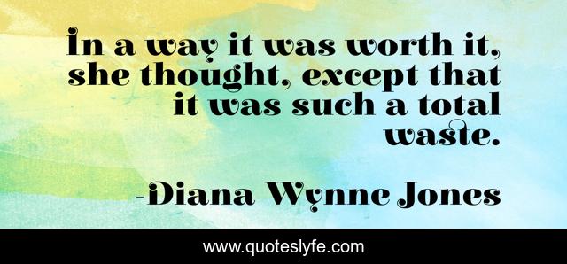 This page presents the quote "In a way it was worth it, she thought, except that it was such a total waste.". Author of this quote is Diana Wynne Jones. This quote is about humorous, fire-and-hemlock,.
