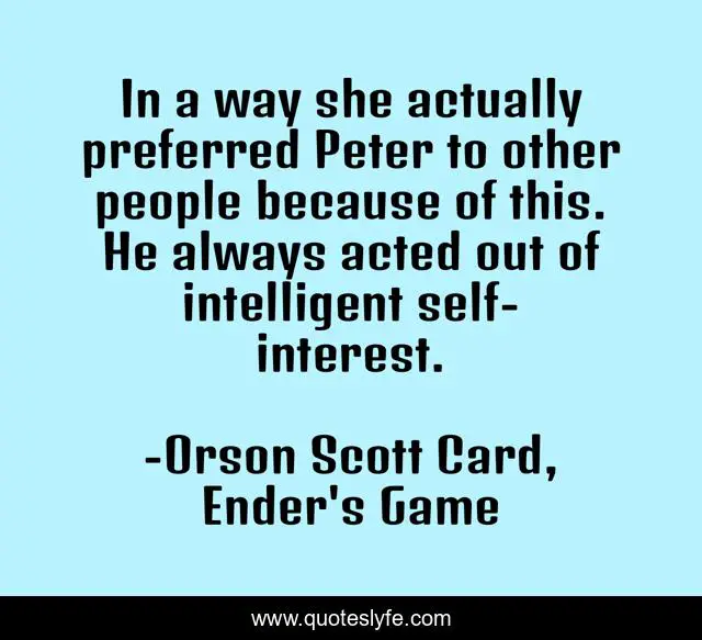 This page presents the quote "In a way she actually preferred Peter to other people because of this. He always acted out of intelligent self-interest.". Author of this quote is Orson Scott Card, Ender's Game. This quote is about self-interest, people-skills, people,.