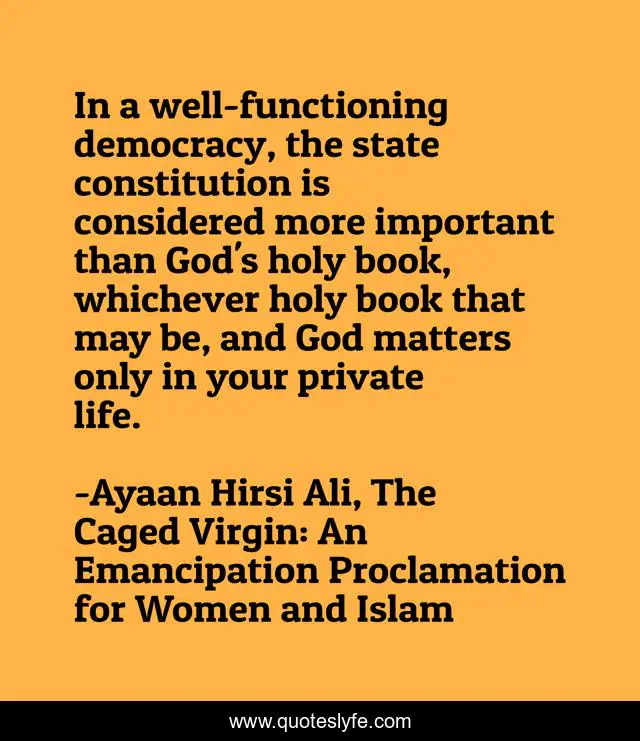 This page presents the quote "In a well-functioning democracy, the state constitution is considered more important than God's holy book, whichever holy book that may be, and God matters only in your private life.". Author of this quote is Ayaan Hirsi Ali, The Caged Virgin: An Emancipation Proclamation for Women and Islam. This quote is about democracy, government, god, muslim, religion, holy-book, islam,.