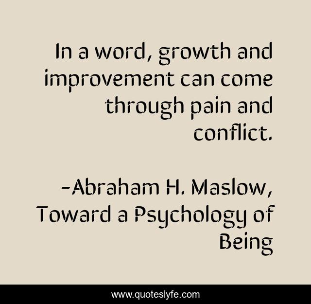 This page presents the quote "In a word, growth and improvement can come through pain and conflict.". Author of this quote is Abraham H. Maslow, Toward a Psychology of Being. This quote is about transcendence, growth, pain, conflict, improvement,.