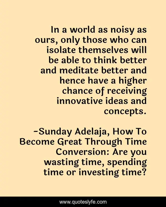 This page presents the quote "In a world as noisy as ours, only those who can isolate themselves will be able to think better and meditate better and hence have a higher chance of receiving innovative ideas and concepts.". Author of this quote is Sunday Adelaja, How To Become Great Through Time Conversion: Are you wasting time, spending time or investing time?. This quote is about life, innovations, meditation, conversion, productivity, wealth, ideas, greatness, waste,.