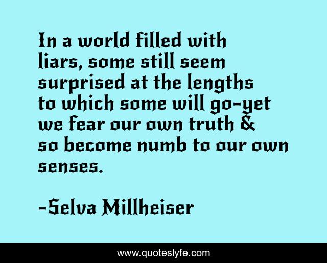 This page presents the quote "In a world filled with liars, some still seem surprised at the lengths to which some will go-yet we fear our own truth & so become numb to our own senses.". Author of this quote is Selva Millheiser. This quote is about blindness, fear, self-awareness,.
