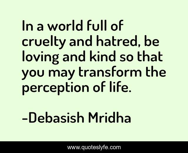 This page presents the quote "In a world full of cruelty and hatred, be loving and kind so that you may transform the perception of life.". Author of this quote is Debasish Mridha. This quote is about cruelty-and-hatred, philosophy, debasish-mridha, be-kind, quotes, perception-of-life, inspirational, in-a-world-full-of-cruelty, enthusiasm,.