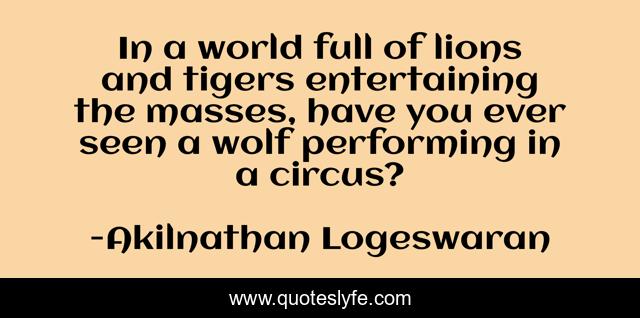 This page presents the quote "In a world full of lions and tigers entertaining the masses, have you ever seen a wolf performing in a circus?". Author of this quote is Akilnathan Logeswaran. This quote is about leaders, entertainment, masses, circus, tiger, lion, leadership, wolf, authenticity,.