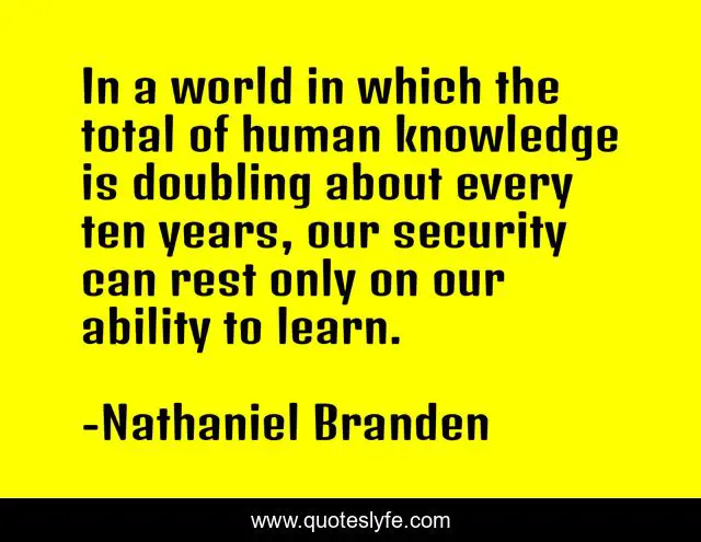 This page presents the quote "In a world in which the total of human knowledge is doubling about every ten years, our security can rest only on our ability to learn.". Author of this quote is Nathaniel Branden. This quote is about world, security, rest,.