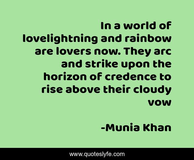 This page presents the quote "In a world of lovelightning and rainbow are lovers now. They arc and strike upon the horizon of credence to rise above their cloudy vow". Author of this quote is Munia Khan. This quote is about rainbow, cloudy-day, love, horizon, striking, arcing, light-and-darkness, rise, upon,.