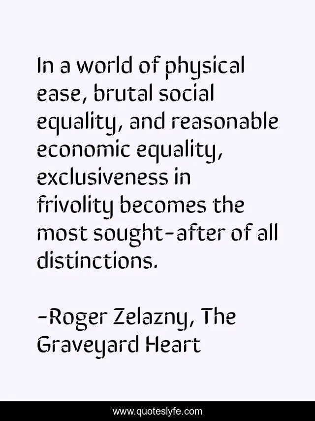 This page presents the quote "In a world of physical ease, brutal social equality, and reasonable economic equality, exclusiveness in frivolity becomes the most sought-after of all distinctions.". Author of this quote is Roger Zelazny, The Graveyard Heart. This quote is about distinction, equality, frivolity,.