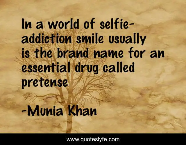 This page presents the quote "In a world of selfie-addiction smile usually is the brand name for an essential drug called pretense". Author of this quote is Munia Khan. This quote is about narcissism, narcissists, false, smiles, selfie, brand-name, pretence, drug, self,.
