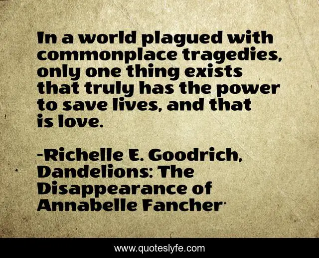 This page presents the quote "In a world plagued with commonplace tragedies, only one thing exists that truly has the power to save lives, and that is love.". Author of this quote is Richelle E. Goodrich, Dandelions: The Disappearance of Annabelle Fancher. This quote is about love, compassion, tragedies, charity, richelle, healing, richelle-goodrich, kindness, tragedy,.