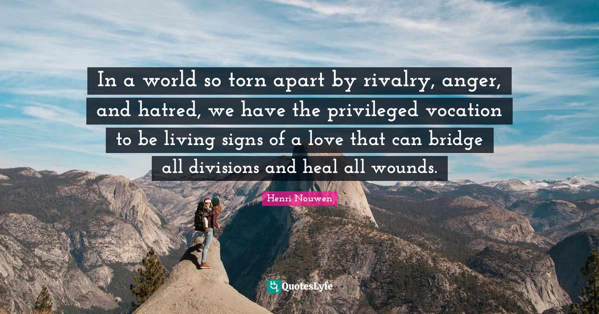This page presents the quote "In a world so torn apart by rivalry, anger, and hatred, we have the privileged vocation to be living signs of a love that can bridge all divisions and heal all wounds.". Author of this quote is Henri Nouwen. This quote is about love, heal, anger, rivalry, wounds, torn apart, privileged, world, bridges,.