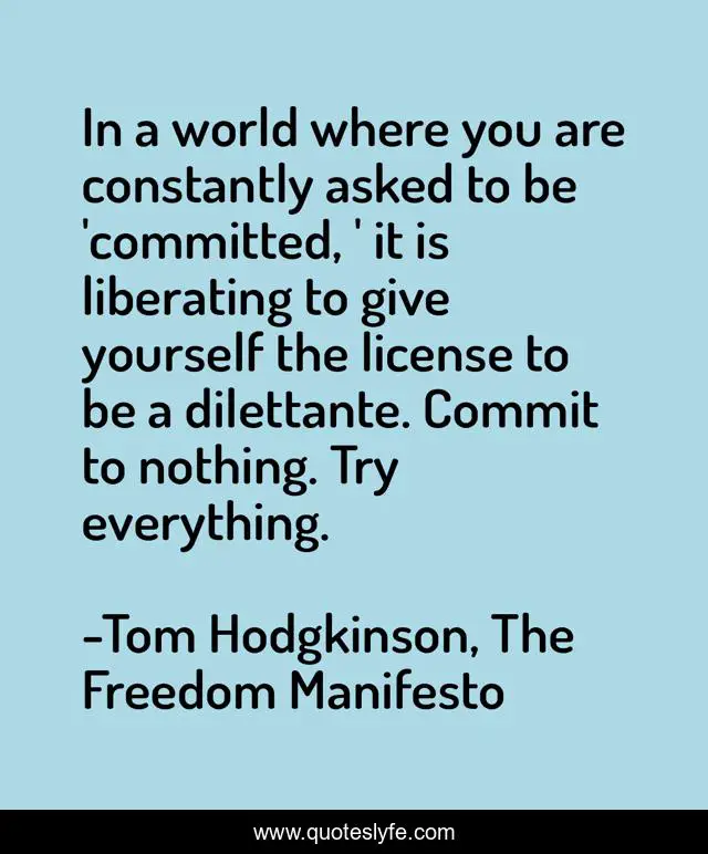 This page presents the quote "In a world where you are constantly asked to be 'committed, ' it is liberating to give yourself the license to be a dilettante. Commit to nothing. Try everything.". Author of this quote is Tom Hodgkinson, The Freedom Manifesto. .