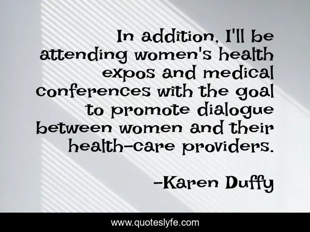 This page presents the quote "In addition, I'll be attending women's health expos and medical conferences with the goal to promote dialogue between women and their health-care providers.". Author of this quote is Karen Duffy. This quote is about health, goal, women,.