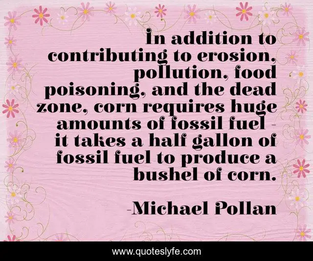 This page presents the quote "In addition to contributing to erosion, pollution, food poisoning, and the dead zone, corn requires huge amounts of fossil fuel - it takes a half gallon of fossil fuel to produce a bushel of corn.". Author of this quote is Michael Pollan. This quote is about environmental, corn,.