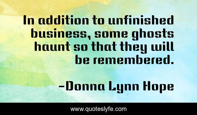 This page presents the quote "In addition to unfinished business, some ghosts haunt so that they will be remembered.". Author of this quote is Donna Lynn Hope. This quote is about ghost, remembered, ghosts, remember, unfinished-business,.