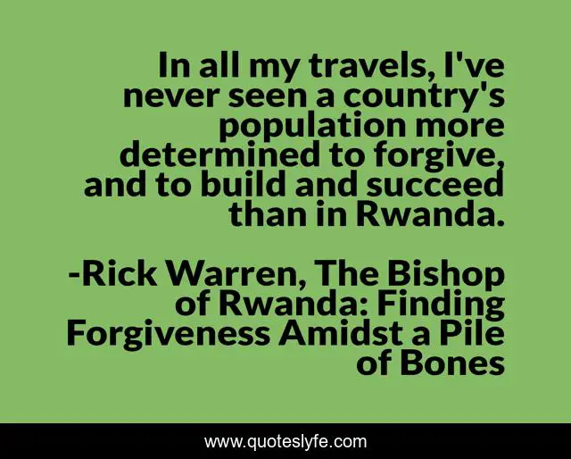This page presents the quote "In all my travels, I've never seen a country's population more determined to forgive, and to build and succeed than in Rwanda.". Author of this quote is Rick Warren, The Bishop of Rwanda: Finding Forgiveness Amidst a Pile of Bones. This quote is about faith, rwanda, forgiveness, genocide,.