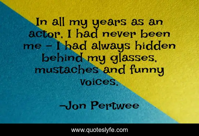 This page presents the quote "In all my years as an actor, I had never been me - I had always hidden behind my glasses, mustaches and funny voices.". Author of this quote is Jon Pertwee. This quote is about me, actor, glasses,.