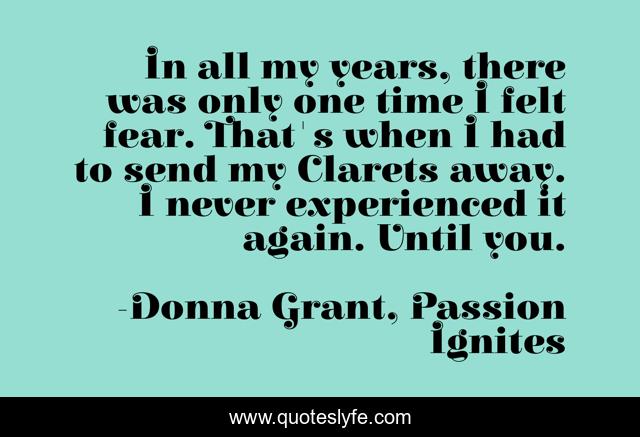 This page presents the quote "In all my years, there was only one time I felt fear. That's when I had to send my Clarets away. I never experienced it again. Until you.". Author of this quote is Donna Grant, Passion Ignites. This quote is about dragon-kings, paranormal-romance,.