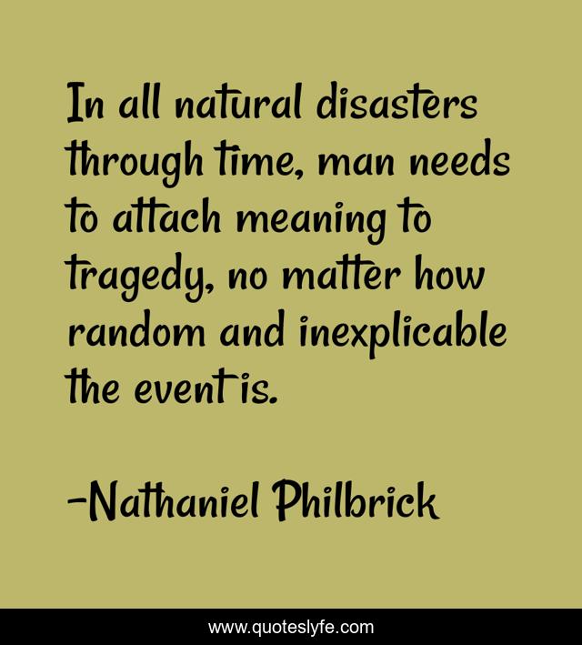 This page presents the quote "In all natural disasters through time, man needs to attach meaning to tragedy, no matter how random and inexplicable the event is.". Author of this quote is Nathaniel Philbrick. This quote is about meaning, tragedy, man,.