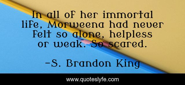 This page presents the quote "In all of her immortal life, Morweena had never felt so alone, helpless or weak. So scared.". Author of this quote is S. Brandon King. This quote is about paranormal-romance, vampires,.