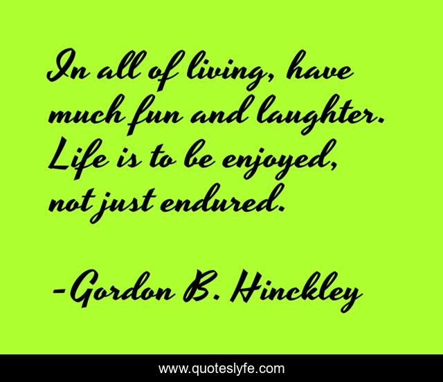 This page presents the quote "In all of living, have much fun and laughter. Life is to be enjoyed, not just endured.". Author of this quote is Gordon B. Hinckley. This quote is about religion, life, enjoy-life,.