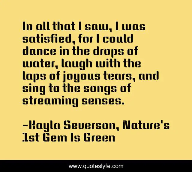This page presents the quote "In all that I saw, I was satisfied, for I could dance in the drops of water, laugh with the laps of joyous tears, and sing to the songs of streaming senses.". Author of this quote is Kayla Severson, Nature's 1st Gem Is Green. This quote is about senses, nature, joy, tears, elements, sight,.