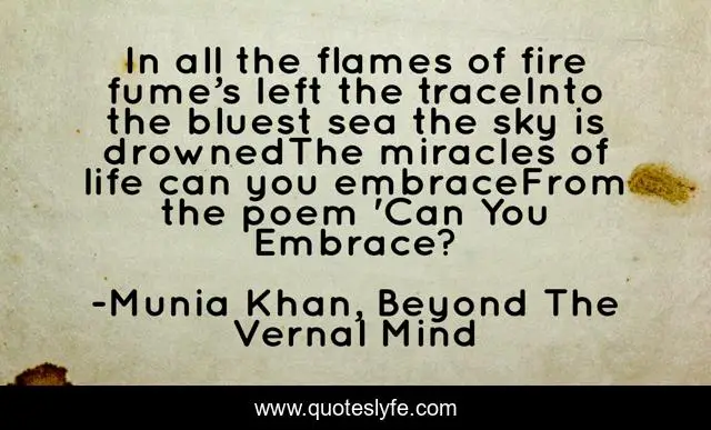 This page presents the quote "In all the flames of fire fume’s left the traceInto the bluest sea the sky is drownedThe miracles of life can you embraceFrom the poem 'Can You Embrace?". Author of this quote is Munia Khan, Beyond The Vernal Mind. This quote is about miracles, poem, life, flames, embrace, sky, poetry, miracle, bluest,.