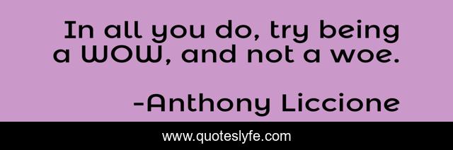 This page presents the quote "In all you do, try being a WOW, and not a woe.". Author of this quote is Anthony Liccione. This quote is about distress, awesome, far-out, try-your-best, yes, gosh, one-of-a-kind, wow, hot-damn,.
