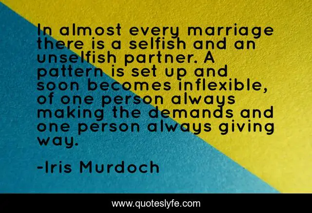 This page presents the quote "In almost every marriage there is a selfish and an unselfish partner. A pattern is set up and soon becomes inflexible, of one person always making the demands and one person always giving way.". Author of this quote is Iris Murdoch. This quote is about giving, selfish, partner,.