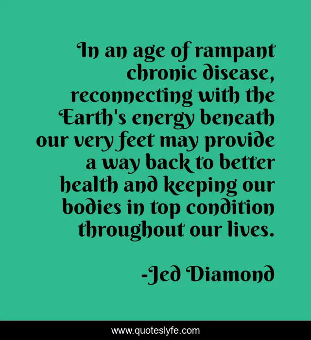 This page presents the quote "In an age of rampant chronic disease, reconnecting with the Earth's energy beneath our very feet may provide a way back to better health and keeping our bodies in top condition throughout our lives.". Author of this quote is Jed Diamond. This quote is about men, stress-relief,.