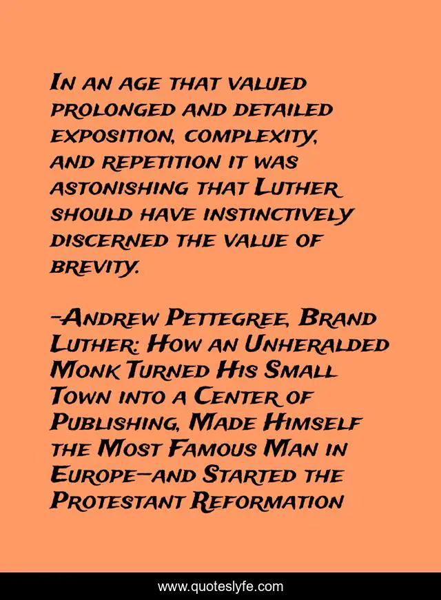 This page presents the quote "In an age that valued prolonged and detailed exposition, complexity, and repetition it was astonishing that Luther should have instinctively discerned the value of brevity.". Author of this quote is Andrew Pettegree, Brand Luther: How an Unheralded Monk Turned His Small Town into a Center of Publishing, Made Himself the Most Famous Man in Europe—and Started the Protestant Reformation. This quote is about communication, self-discipline, reflection, silence,.