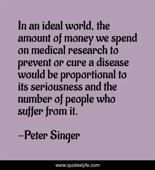 This page presents the quote "In an ideal world, the amount of money we spend on medical research to prevent or cure a disease would be proportional to its seriousness and the number of people who suffer from it.". Author of this quote is Peter Singer. This quote is about money, world, research,.