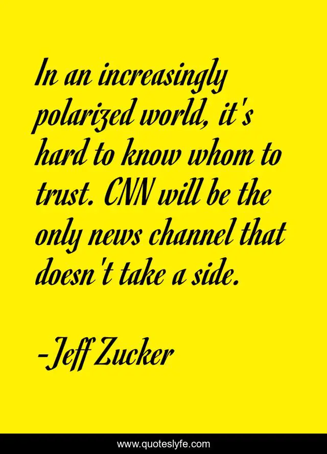 This page presents the quote "In an increasingly polarized world, it's hard to know whom to trust. CNN will be the only news channel that doesn't take a side.". Author of this quote is Jeff Zucker. This quote is about world, news,.