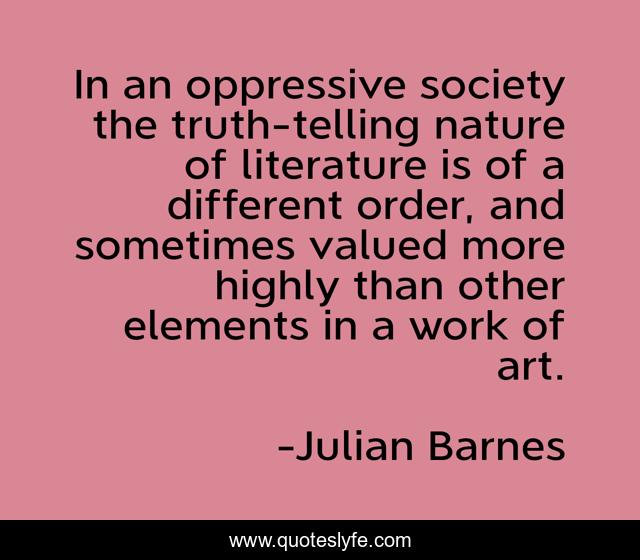 This page presents the quote "In an oppressive society the truth-telling nature of literature is of a different order, and sometimes valued more highly than other elements in a work of art.". Author of this quote is Julian Barnes. This quote is about work, art, nature,.