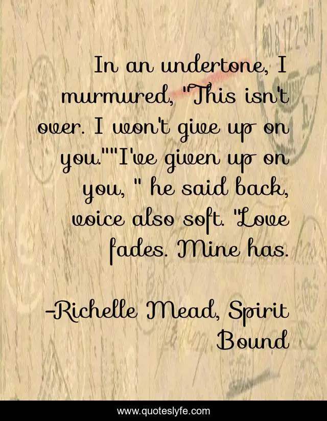 This page presents the quote "In an undertone, I murmured, "This isn't over. I won't give up on you.""I've given up on you, " he said back, voice also soft. "Love fades. Mine has.". Author of this quote is Richelle Mead, Spirit Bound. This quote is about dimitri-belikov, heartbreak, rose-hathaway,.