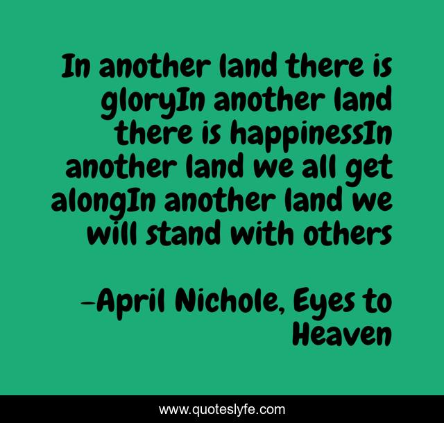 This page presents the quote "In another land there is gloryIn another land there is happinessIn another land we all get alongIn another land we will stand with others". Author of this quote is April Nichole, Eyes to Heaven. This quote is about faith, religious, poetry,.
