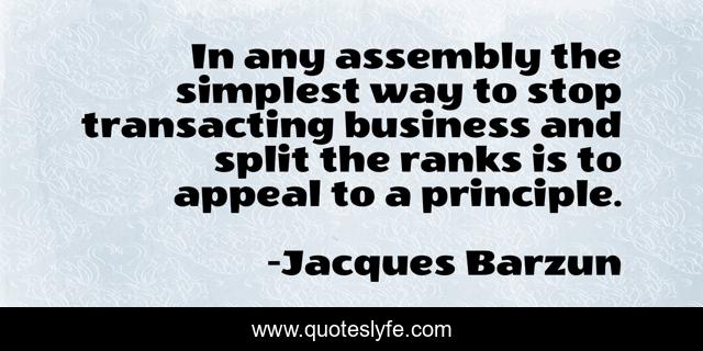 This page presents the quote "In any assembly the simplest way to stop transacting business and split the ranks is to appeal to a principle.". Author of this quote is Jacques Barzun. This quote is about ethics, morality,.