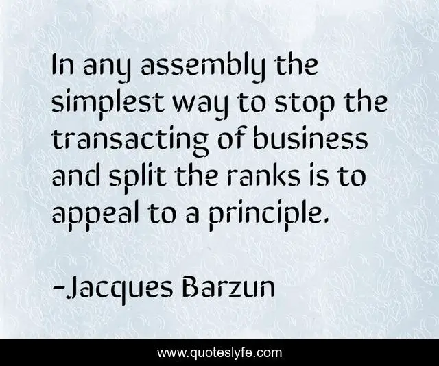 This page presents the quote "In any assembly the simplest way to stop the transacting of business and split the ranks is to appeal to a principle.". Author of this quote is Jacques Barzun. This quote is about society, social,.