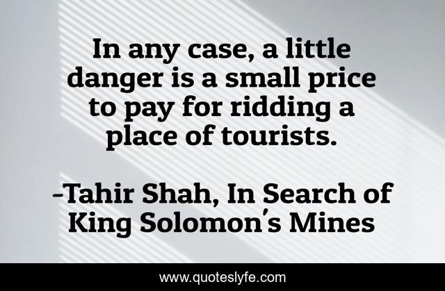 This page presents the quote "In any case, a little danger is a small price to pay for ridding a place of tourists.". Author of this quote is Tahir Shah, In Search of King Solomon's Mines. This quote is about tourism, tourists, danger,.
