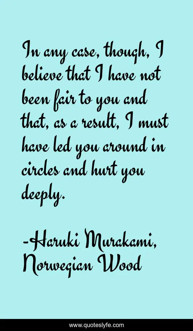 This page presents the quote "In any case, though, I believe that I have not been fair to you and that, as a result, I must have led you around in circles and hurt you deeply.". Author of this quote is Haruki Murakami, Norwegian Wood. This quote is about books, book, norwegian-wood,.