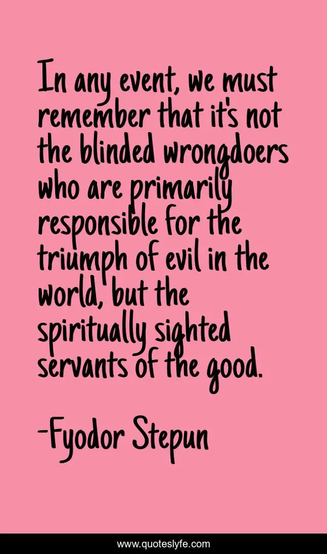 This page presents the quote "In any event, we must remember that it's not the blinded wrongdoers who are primarily responsible for the triumph of evil in the world, but the spiritually sighted servants of the good.". Author of this quote is Fyodor Stepun. This quote is about human-nature, humanity-and-society, political-science, religion,.