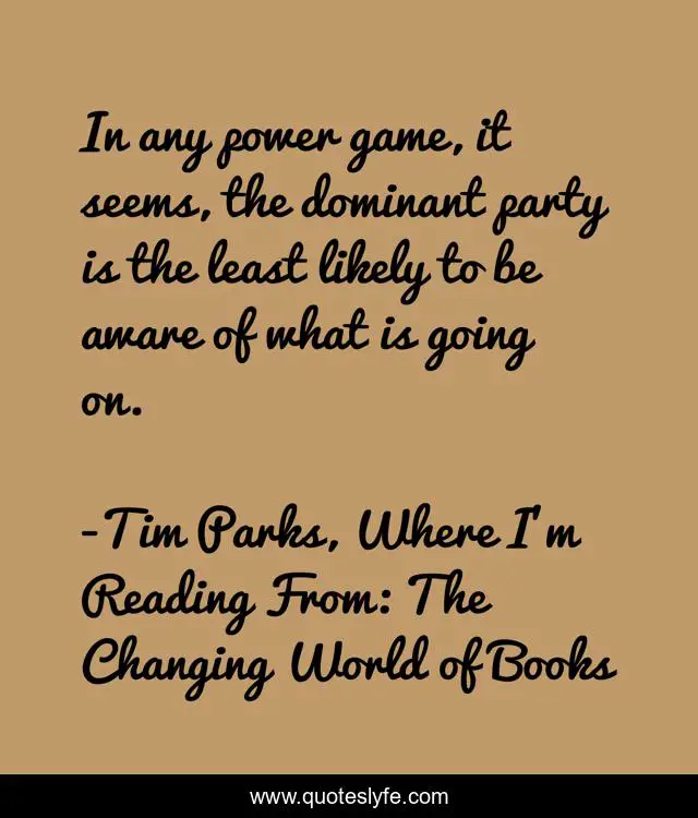 This page presents the quote "In any power game, it seems, the dominant party is the least likely to be aware of what is going on.". Author of this quote is Tim Parks, Where I'm Reading From: The Changing World of Books. .