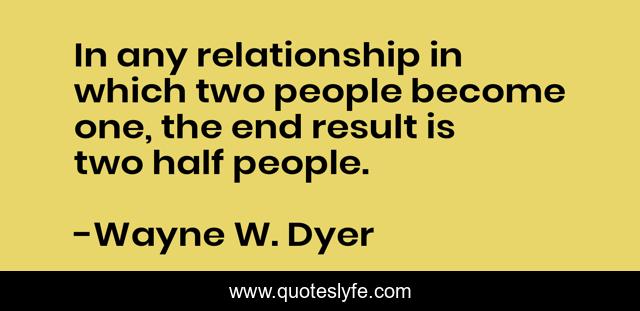 This page presents the quote "In any relationship in which two people become one, the end result is two half people.". Author of this quote is Wayne W. Dyer. This quote is about relationships, romance, love, affection,.