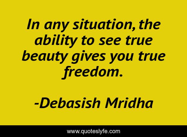 This page presents the quote "In any situation, the ability to see true beauty gives you true freedom.". Author of this quote is Debasish Mridha. This quote is about philosophy, beauty, freedom, debasish, debasish-mridha, inspirational, mridha, enthusiasm,.