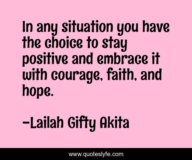 This page presents the quote "In any situation you have the choice to stay positive and embrace it with courage, faith, and hope.". Author of this quote is Lailah Gifty Akita. This quote is about determined-spirit, positive-mindset, courageous,.