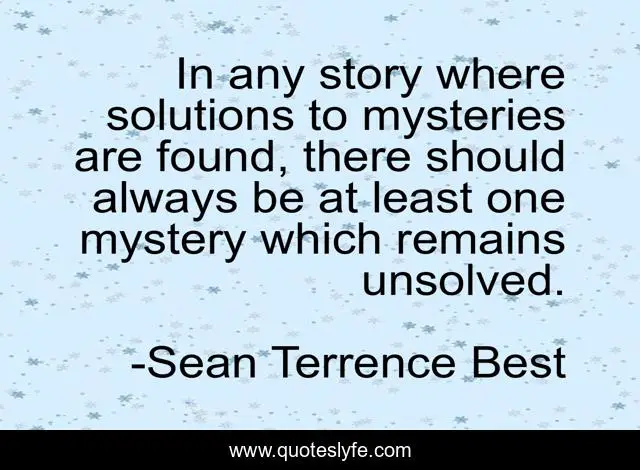 This page presents the quote "In any story where solutions to mysteries are found, there should always be at least one mystery which remains unsolved.". Author of this quote is Sean Terrence Best. This quote is about mystery, horror, suspense, thriller,.
