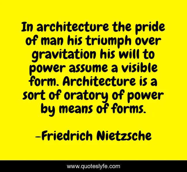 This page presents the quote "In architecture the pride of man his triumph over gravitation his will to power assume a visible form. Architecture is a sort of oratory of power by means of forms.". Author of this quote is Friedrich Nietzsche. This quote is about architecture, architects,.