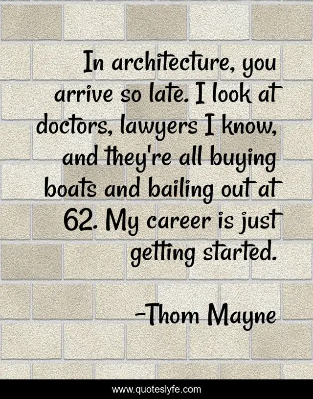 This page presents the quote "In architecture, you arrive so late. I look at doctors, lawyers I know, and they're all buying boats and bailing out at 62. My career is just getting started.". Author of this quote is Thom Mayne. .